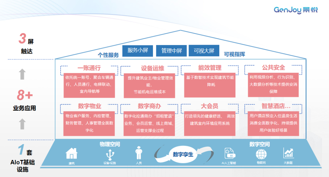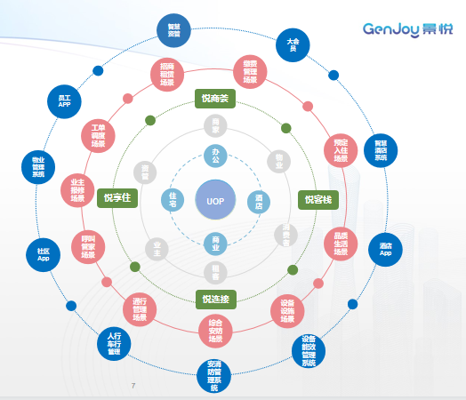 在景悅科技構建的(de)智慧城(chéng)區(qū)體系中,将以UOP平台爲核心,“悅享住”“悅商荟”“悅客棧”“悅連接”等用(yòng)戶端爲觸手,拉通(tōng)跨業态、全用(yòng)戶的(de)數據,服務于“6+20+120”的(de)城(chéng)區(qū)智慧全場(chǎng)景。