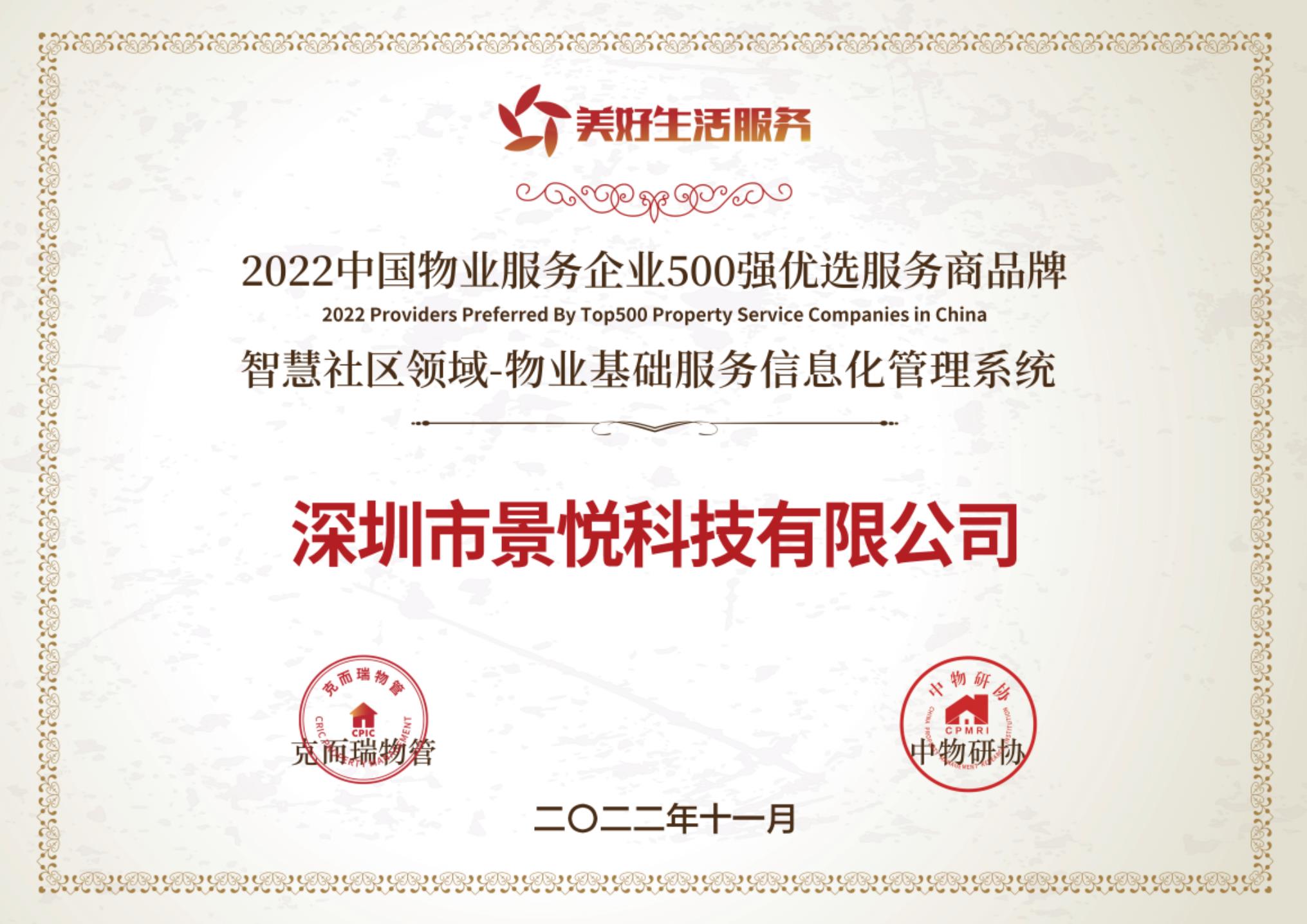 2022深圳國際智慧物(wù)業産業博覽會上,景悅科技入選“2022中國物(wù)業服務企業500強優選服務商品牌”,該獎項由克而瑞物(wù)管和(hé)中物(wù)研協共同發布,景悅科技憑借智慧空間運營管理(lǐ)爲物(wù)企提供優質的(de)增值服務入選。