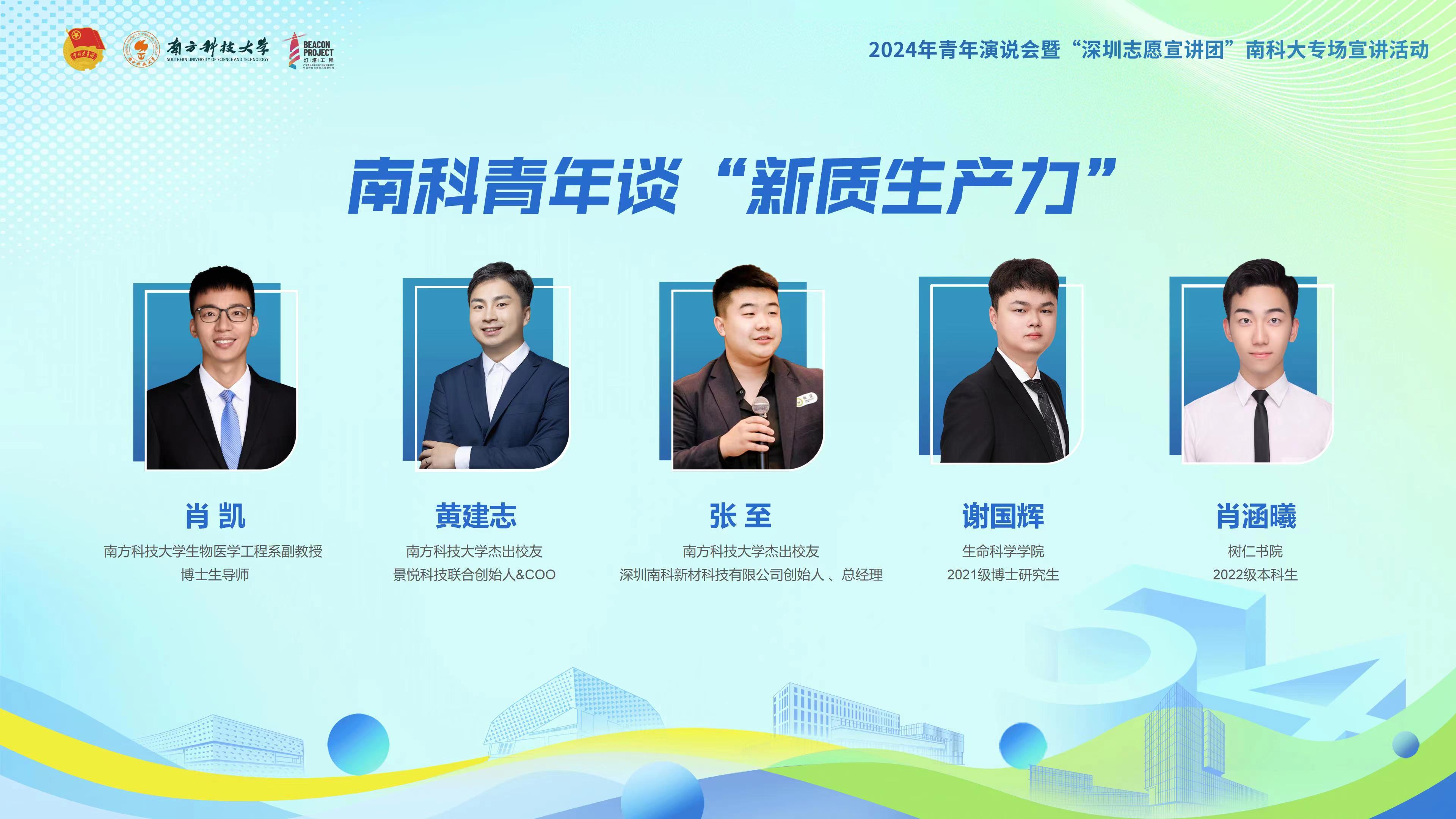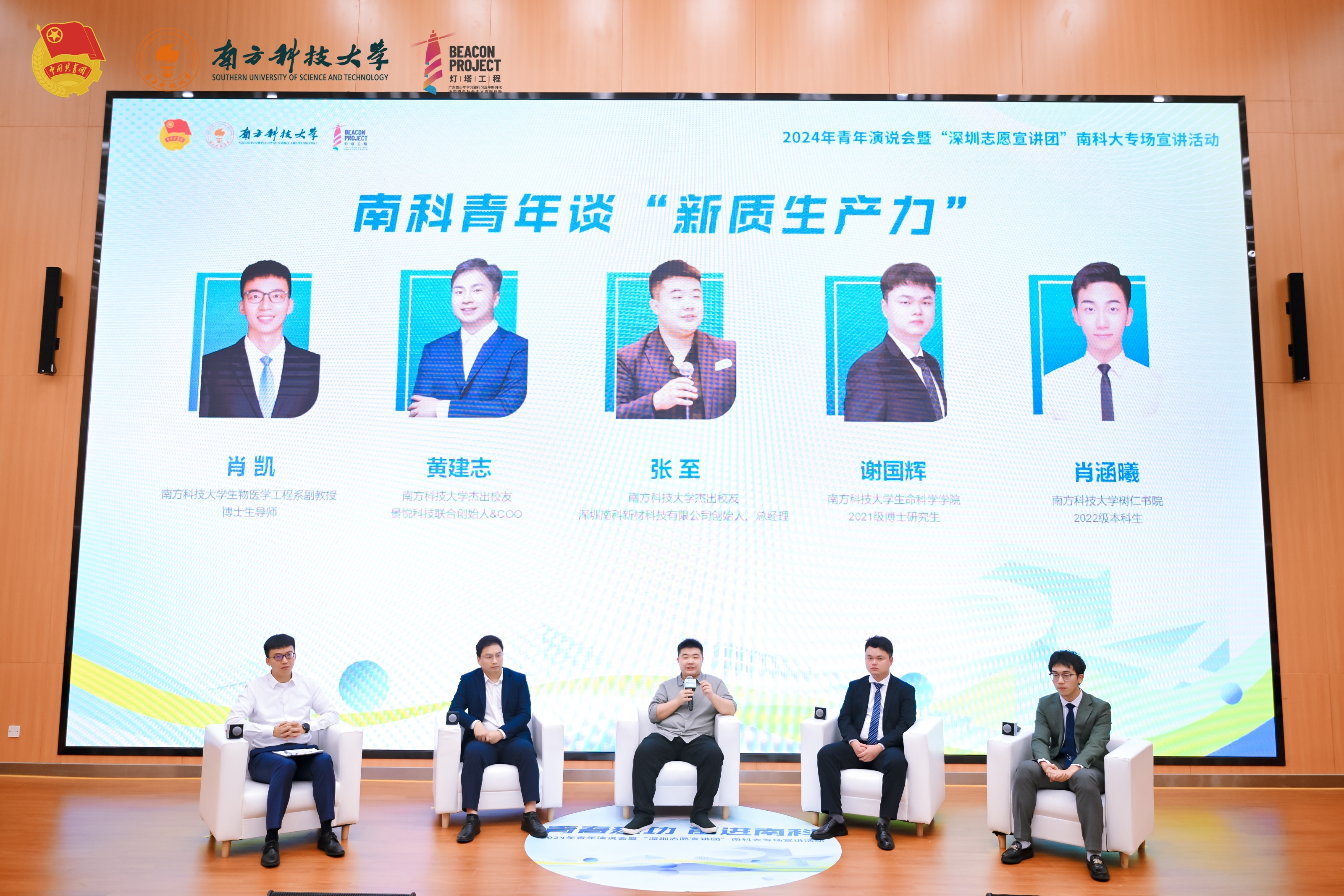 青年對(duì)談活動話(huà)題圍繞著(zhe)“新質生産力”展開,南(nán)方科技大(dà)學生物(wù)醫學工程系副教授博士生導師肖凱;深圳南(nán)科新材科技有限公司創始人(rén)、總經理(lǐ)張至;生命科學學院2021級博士研究生謝國輝;樹仁書(shū)院2022級本科生肖涵曦一同參與了(le)對(duì)談。